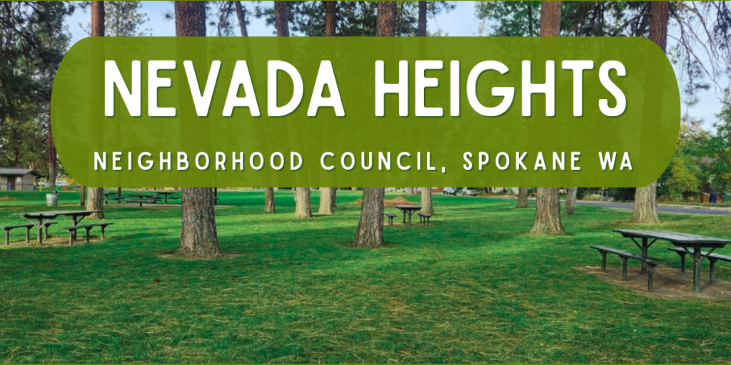 Nevada Heights Neighborhood Council is a volunteer-run organization made up of residents who live within the designated neighborhood boundary that meet regularly to maintain and improve the quality of life in Spokane, increase resident participation in local decision-making, and form an effective partnership between the City and neighborhood residents.